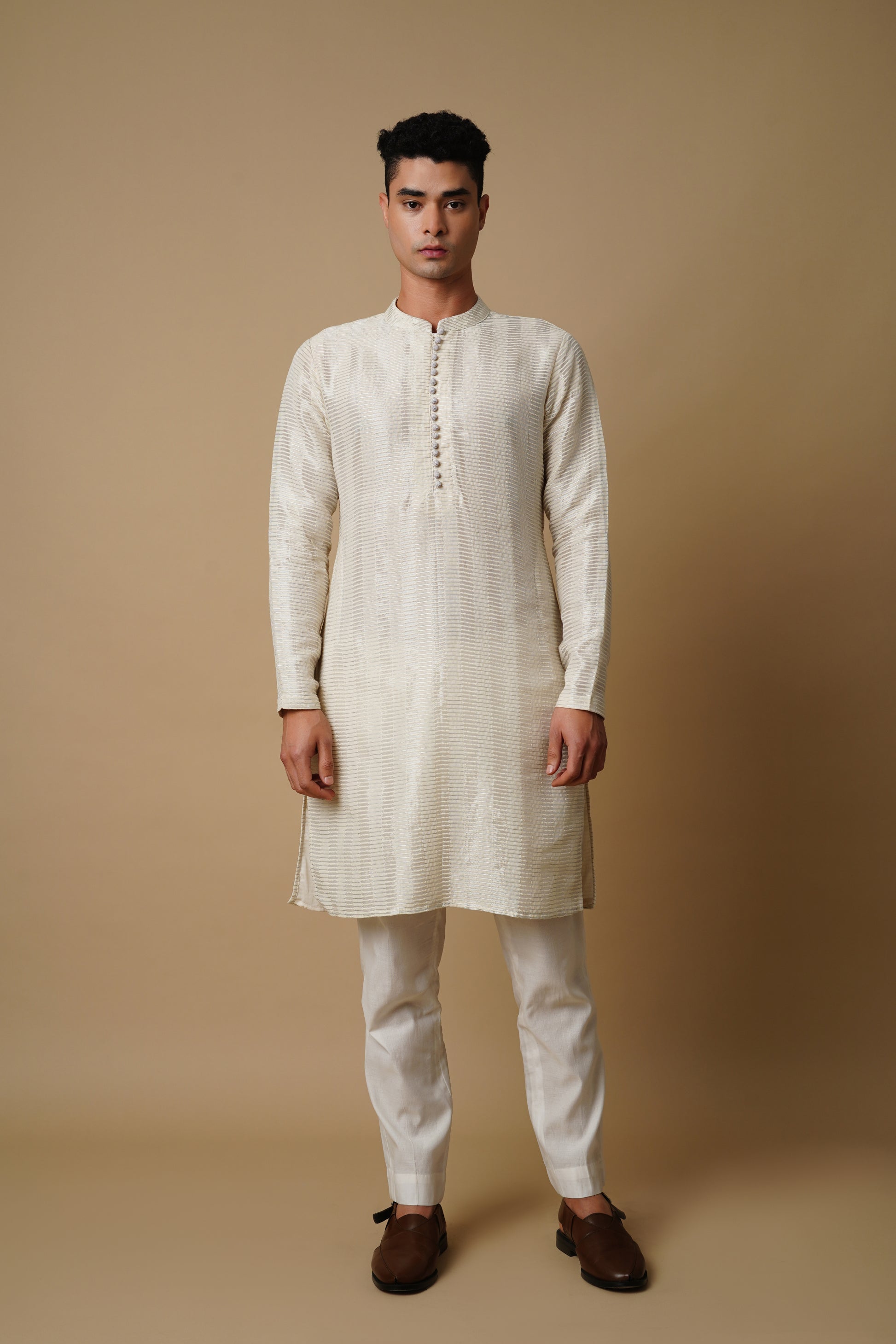 Embrace the allure of traditional Indian craftsmanship with this Kurta Set in Handloom Tissue Chanderi, ensuring you radiate sophistication and grace on every occasion.